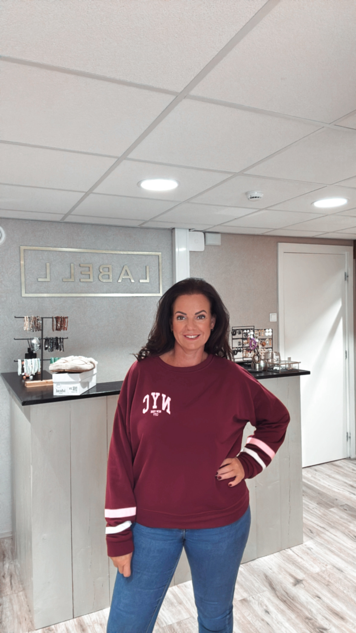 Deze sweater met de tekst “New York” valt op door de stijlvolle kleurcombinatie van bordeaux en roze – een perfecte match.
